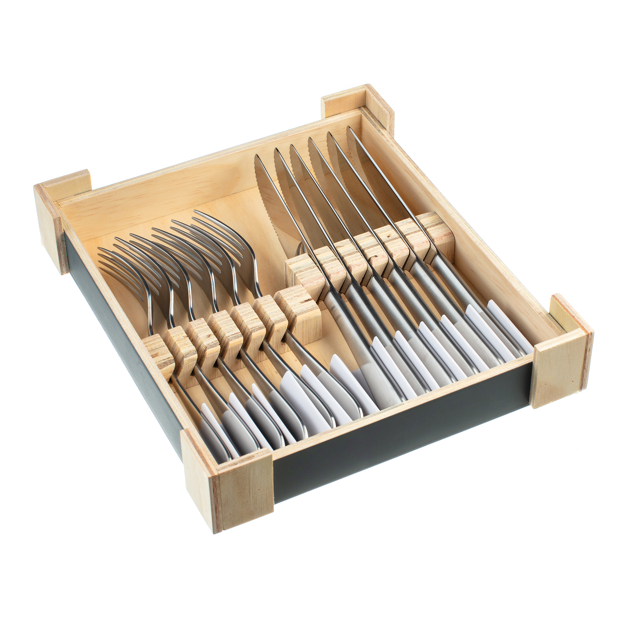 The Mogano Satin Wooden Box Steak Set includes 6 steak knives, and 6 table forks. This set comes within a lovely wooden box, making it the perfect gift for housewarmings and weddings or just as a nice addition to your home.